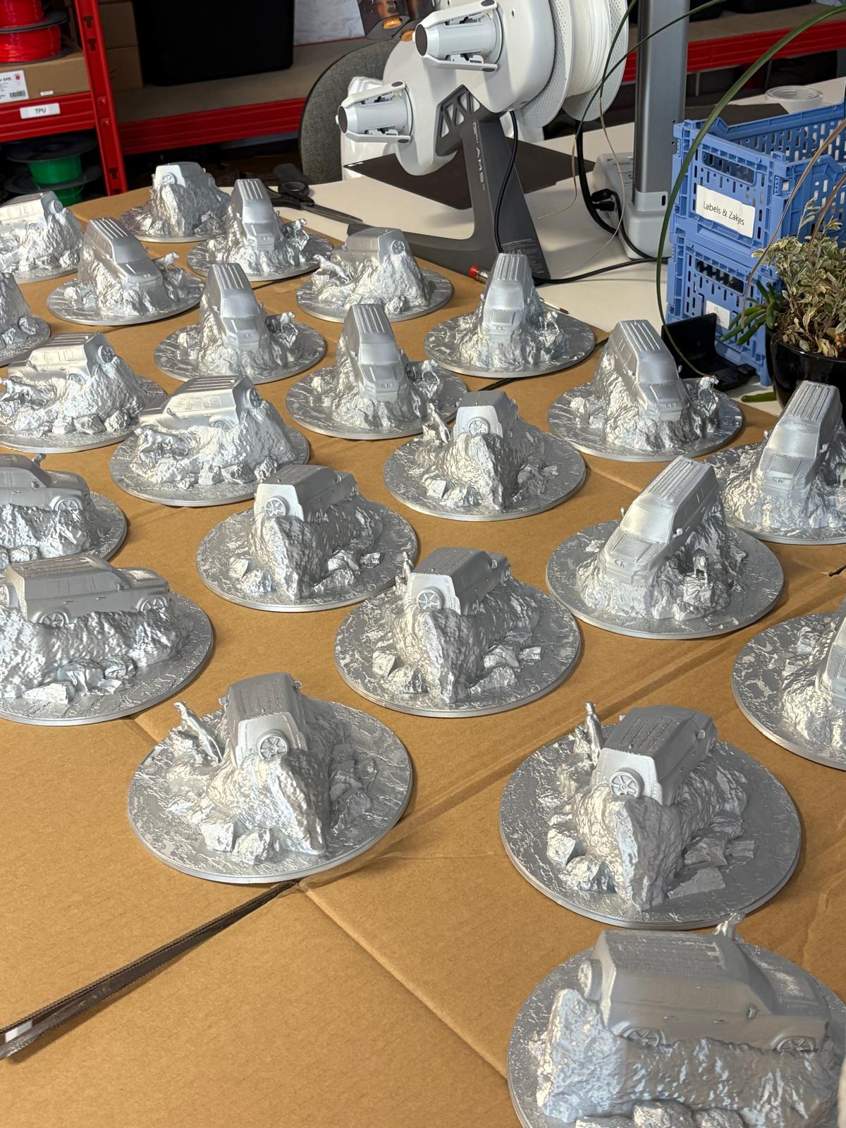 Custom awards I designed for Land Rover De Ridder, the oldest jaguar dealership in Europe. The project celebrated their achievement as the best garage in Belgium for customer satisfaction. My goal for this project was to create an eyecatcher that looked clean and professional. Over 40 awards were created using FDM printers. Later they were spraypainted silver and post-processed by hand.